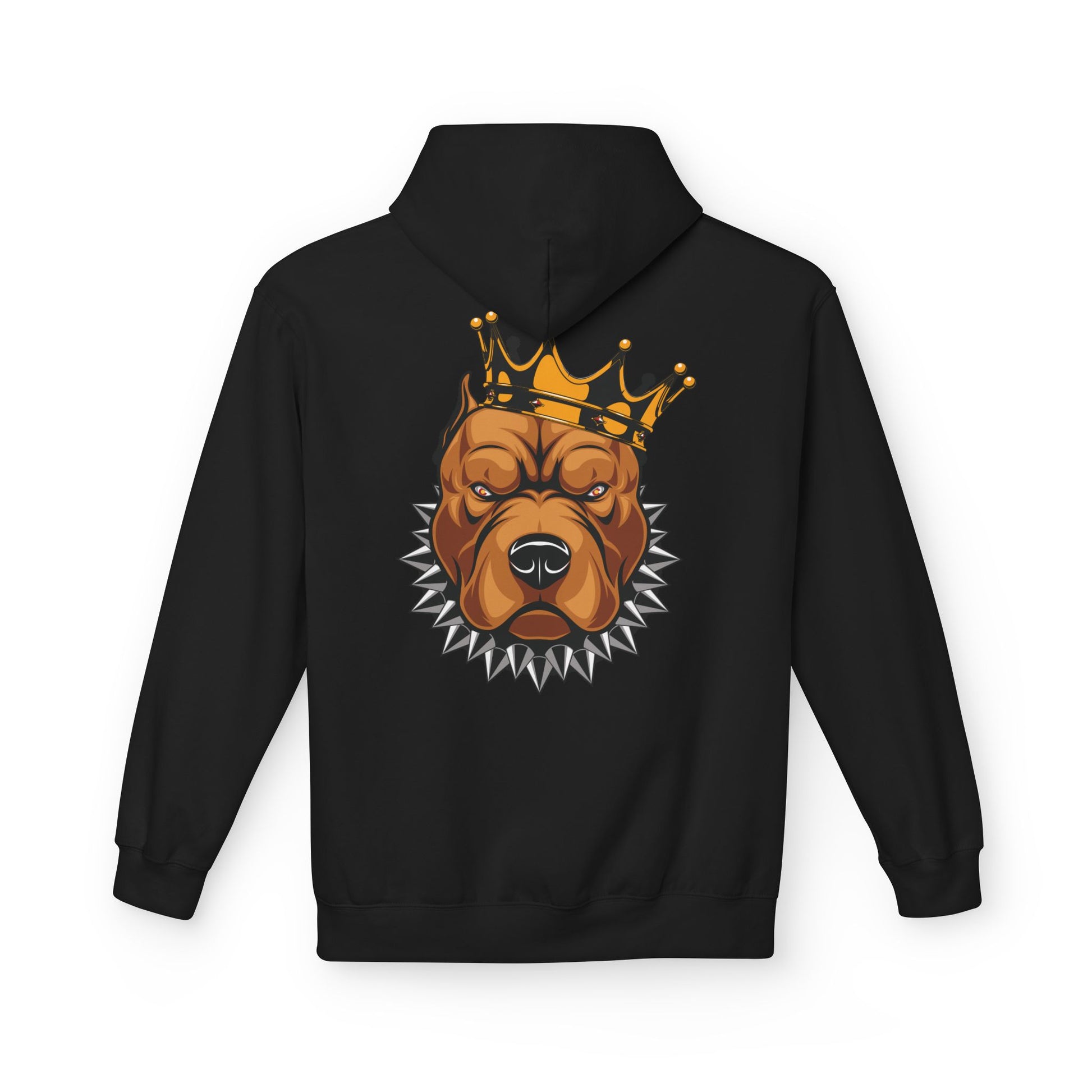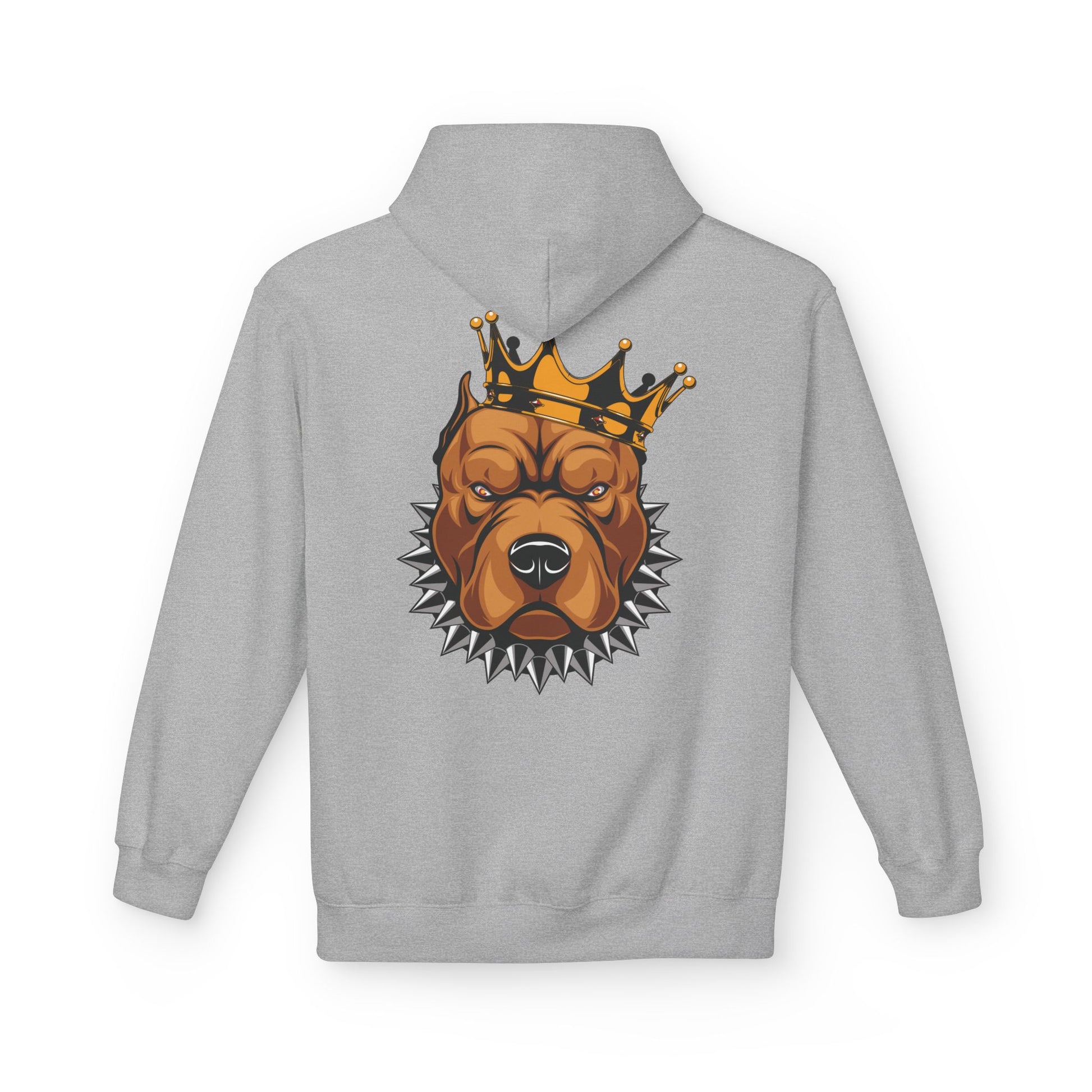 A midweight fleece hoodie that blends streetwise attitude with everyday comfort. The front shows a vintage-style ornate wordmark while the back features a bold crowned pitbull illustration framed by spiked collar details — a look that reads confident, loyal, and a little rebellious. The dropped shoulders and roomy pouch pocket make it easy to throw on for errands, late-night drives, or hanging with friends. Thoughtfully made with OEKO-TEX certified fabric and produced in socially responsible facilities, this hoodie feels substantial without being stiff, and its tear-away label keeps the neck smooth. Wear it when you want to channel steady protection and neighborhood pride without shouting for attention.