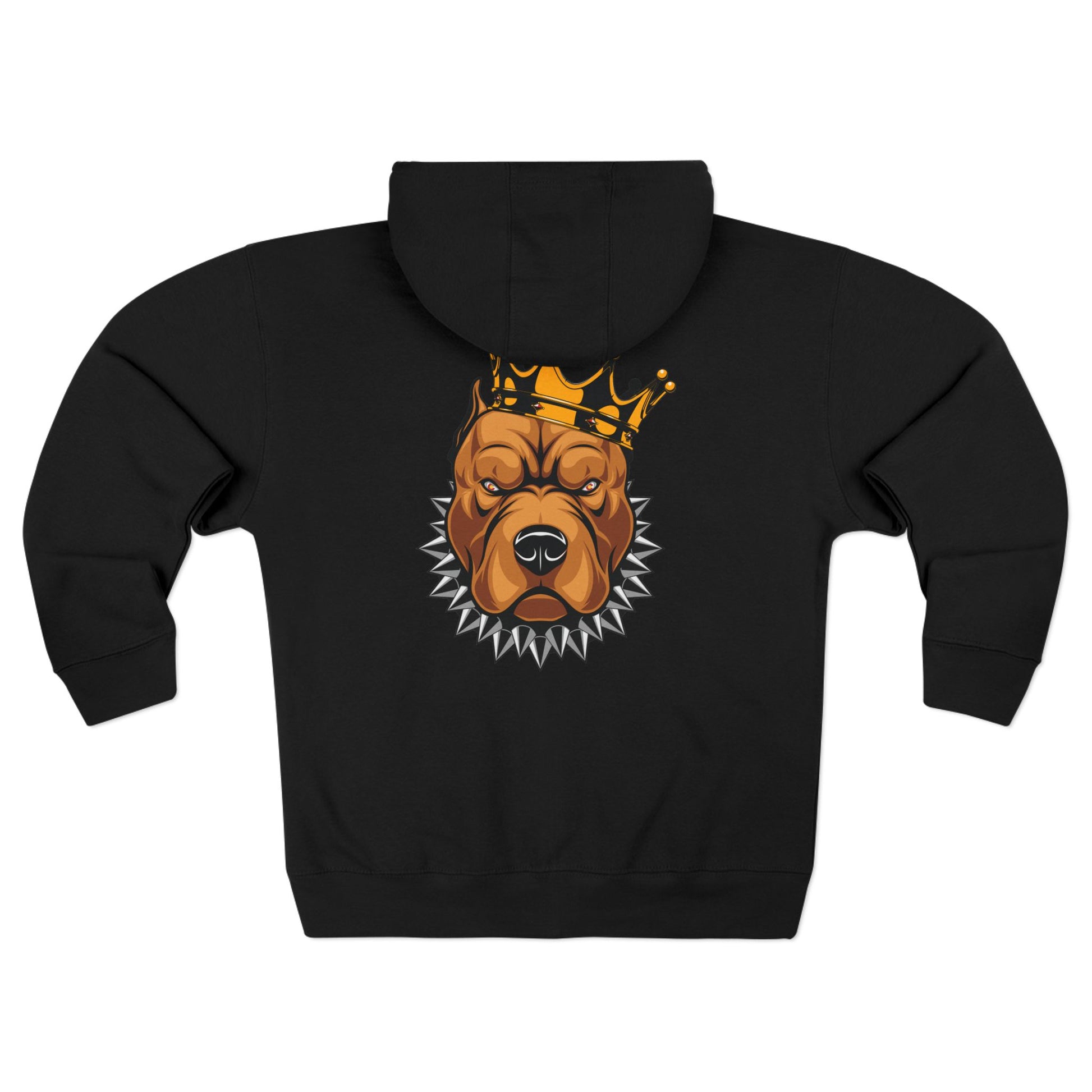 This heavyweight zip-up hoodie brings street energy and quiet confidence to chilly days. The front chest features bold Old English lettering, while the back displays a crowned pitbull portrait with a spiked collar — a look that reads loyalty, edge, and pride. The thick fleece-lined hood and roomy kangaroo pocket make it comfortable for long nights out or relaxed weekends at home. Wear it layered over a tee for skate sessions, post-work coffee runs, or when you want your presence to speak first.